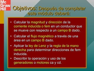 Este documento presenta una lección sobre inducción electromagnética. Explica que cuando un conductor se mueve a través de un campo magnético, se induce una corriente eléctrica. Describe cómo calcular la magnitud y dirección de la corriente inducida y el flujo magnético a través de un área. También cubre la ley de Faraday, la ley de Lenz, y cómo aplicar estas leyes para determinar la dirección de la corriente inducida en diferentes situaciones.