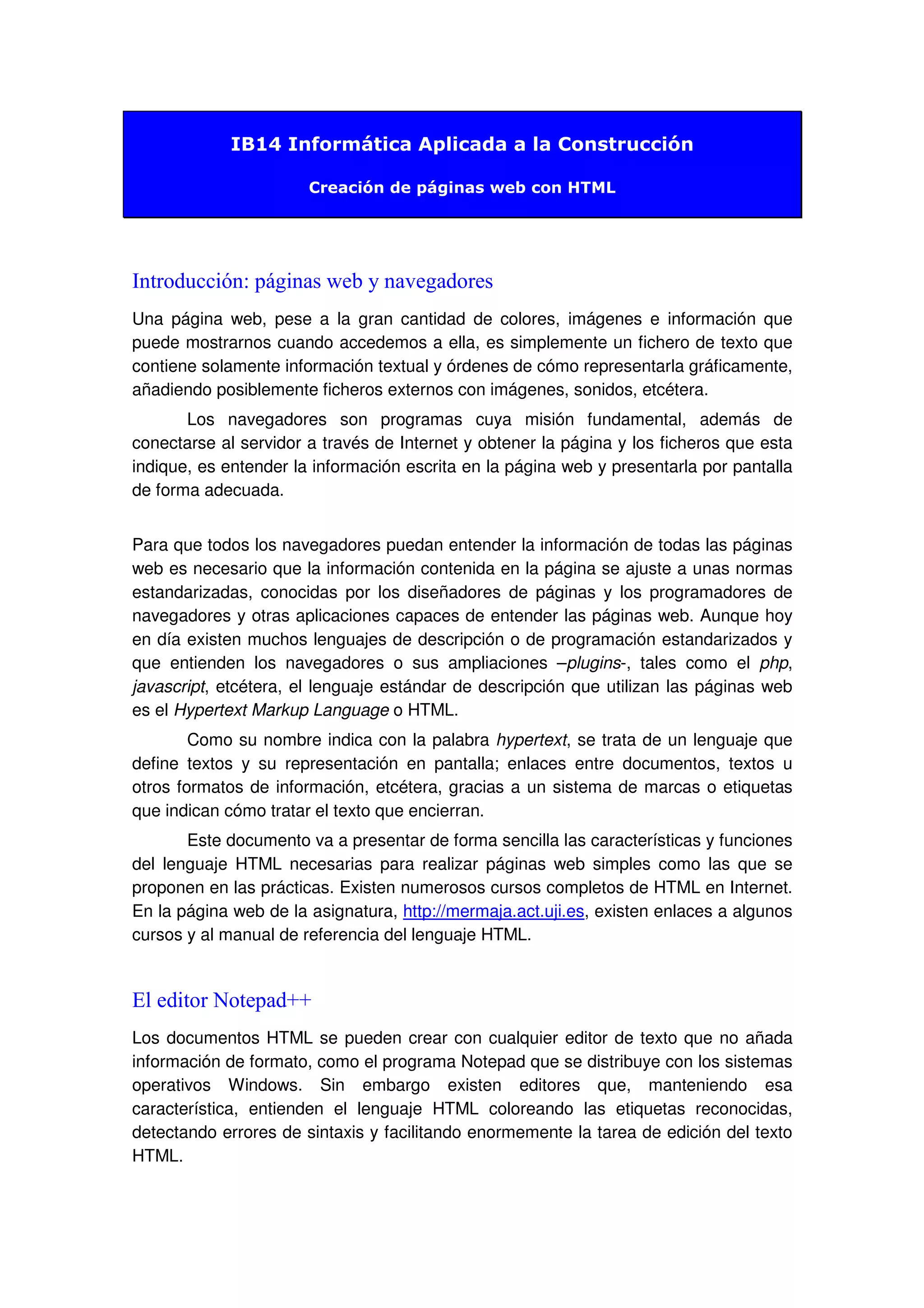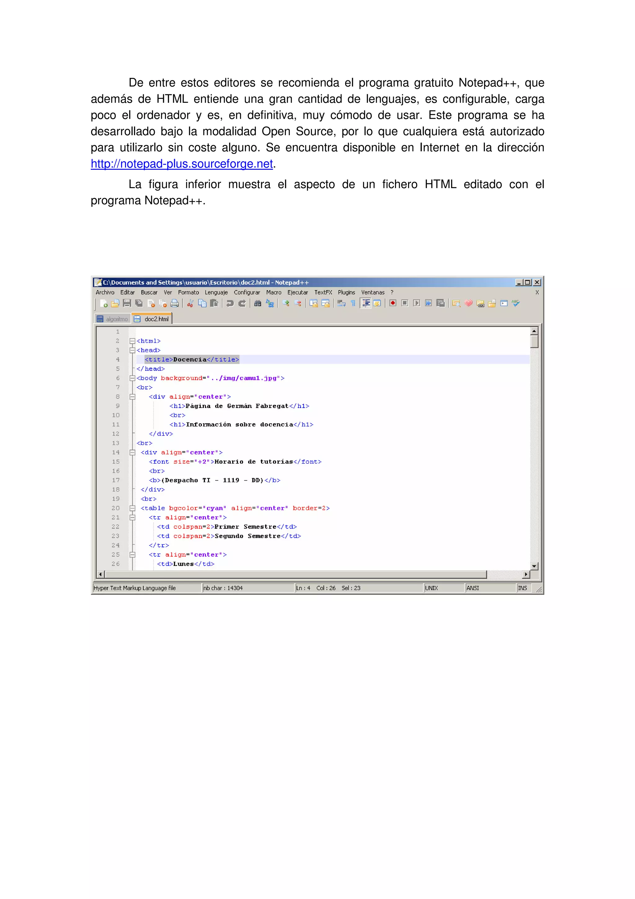 Este documento introduce los conceptos básicos de HTML para crear páginas web. Explica que HTML utiliza etiquetas para indicar cómo se debe mostrar el texto y que los navegadores usan estas etiquetas para renderizar la página. También recomienda el editor Notepad++ para crear archivos HTML y describe algunas etiquetas básicas como <b> para negrita, <i> para itálica y <div> para agrupar texto.