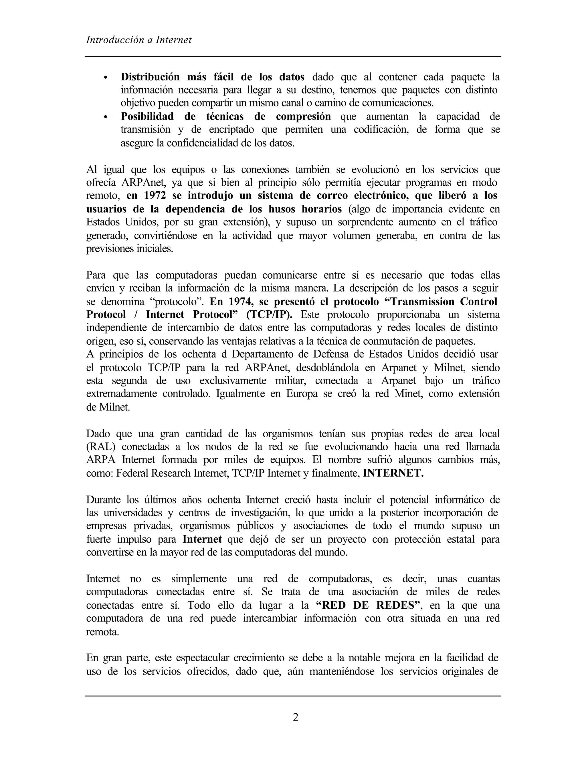 El documento introduce los conceptos básicos de Internet, incluyendo sus orígenes como proyecto militar estadounidense, la evolución hacia una red de redes basada en protocolos TCP/IP, y los servicios fundamentales como correo electrónico y la World Wide Web. Explica también los requisitos técnicos mínimos para acceder a Internet, tales como una computadora, módem, conexión a proveedor, y programas de conexión. Finalmente, describe brevemente la función de normalización técnica desempeñada por la Internet Society.
