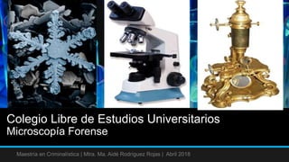 Este documento presenta un curso sobre microscopía forense. Explica que el objetivo del curso es obtener conocimiento sobre el microscopio y su uso para analizar evidencia en lugares de crimen. Incluye cuatro unidades temáticas que cubren la historia y tipos de microscopios, la anatomía del ojo, instrumentación óptica y aplicaciones de la microscopía en criminalística. El documento también incluye un resumen histórico del desarrollo de la microscopía a través de los años.