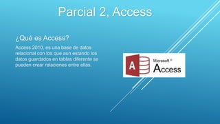 Access 2010 es una base de datos relacional que permite crear tablas y relacionar los datos entre ellas. Ofrece funciones como consultas SQL, formularios, informes y macros. Proporciona ventajas como el uso de SQL, la integración con Office y la facilidad para generar formularios e informes. Sin embargo, tiene desventajas como problemas de mantenimiento para bases grandes y límites de tamaño por tabla.
