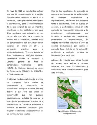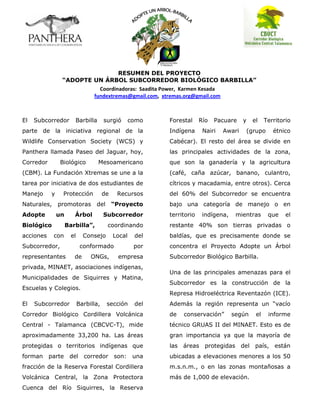 El proyecto "Adopte un Árbol Subcorredor Biológico Barbilla" busca restaurar y conservar el Subcorredor Biológico Barbilla mediante el incentivo económico a los pobladores locales por cada árbol sembrado que sobreviva en sus tierras. El proyecto es coordinado por dos estudiantes y la Fundación Xtremas con el apoyo de organizaciones locales. El Subcorredor Barbilla conecta dos áreas protegidas importantes para la biodiversidad de Costa Rica que se han ido aislado, y el pro