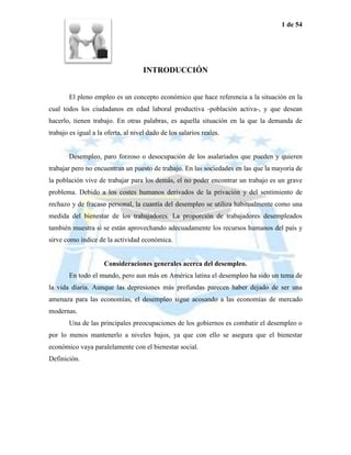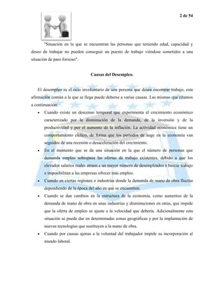 El documento introduce el concepto de desempleo y sus causas. Explica que el desempleo ocurre cuando hay personas en edad laboral que desean trabajar pero no pueden encontrar un empleo. Luego describe los tipos de desempleo (friccional, estructural y cíclico) y los efectos económicos y sociales negativos del desempleo como la pérdida de ingresos y deterioro de la salud física y mental. Finalmente, analiza las interpretaciones económicas del desempleo en términos de la rigidez de los salarios