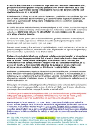 La acción tutorial es un proceso integral y personalizado que favorece la maduración del alumno tanto a nivel escolar como personal. La tutoría y la educación van de la mano para lograr no solo el aprendizaje de conocimientos, sino también la autorrealización de la persona en lo académico, psicológico y social. La orientación escolar es un derecho del alumno que se concreta en servicios y actividades para alcanzar los objetivos del sistema educativo de cada individuo y grupo.