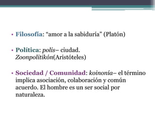 El documento presenta una introducción a la filosofía social y política. Explica que la filosofía busca la sabiduría, la política se refiere a la polis o ciudad, y la sociedad implica asociación y cooperación. Luego resume las ideas de varios filósofos griegos como los pitagóricos, sofistas, Platón y Aristóteles sobre temas como la estructura social, la justicia, la política y la educación.