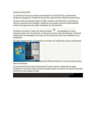 Este documento describe cómo arrancar el programa Microsoft Word 2010 y familiarizarse con su interfaz. Explica que se puede iniciar Word 2010 desde el menú Inicio haciendo clic en "Todos los programas" y luego en "Microsoft Office Word 2010". Una vez iniciado, el primer paso es familiarizarse con las diferentes partes que componen la interfaz de Word 2010.