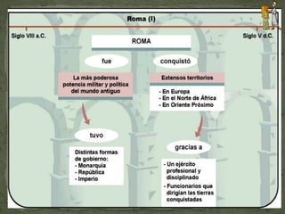 El documento presenta información sobre la edad del universo (13.7 mil millones de años), la edad de la Tierra (entre 4.4 y 5.1 mil millones de años) y las primeras civilizaciones fluviales en Egipto y Mesopotamia, incluyendo los cambios económicos, políticos y sociales que llevaron al surgimiento de ciudades, escritura, religión y nuevas formas de vida. También resume aspectos clave del Imperio Romano como la Pax Romana, conquistas territoriales y la división final del imper