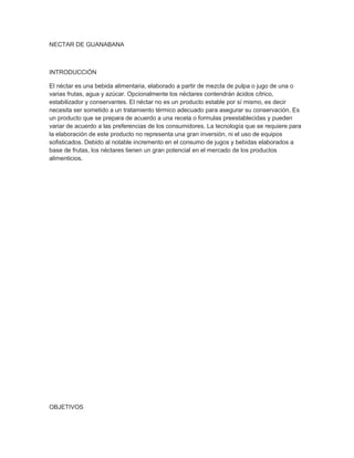 Este documento describe el proceso de elaboración de un néctar de guanabana. Explica que el néctar se produce a partir de la mezcla de pulpa o jugo de frutas, agua y azúcar, la cual debe ser sometida a un tratamiento térmico para su conservación. Luego detalla las etapas del proceso que incluyen la selección, lavado, pelado y pulpeado de la fruta, la estandarización de la mezcla, la pasteurización para reducir microbios, y el envasado y enfriado del producto