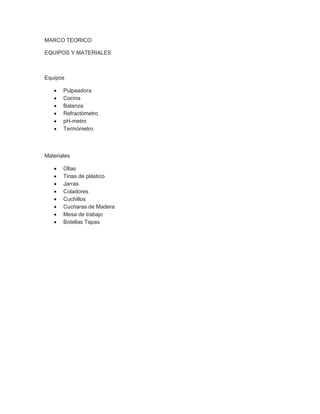 Este documento describe el proceso de elaboración de un néctar de guanabana. Explica que el néctar se produce a partir de la mezcla de pulpa o jugo de frutas con agua y azúcar, la cual debe ser sometida a un tratamiento térmico para su conservación. Luego detalla las etapas del proceso que incluyen la selección, lavado, pelado y pulpeado de la fruta, la estandarización de la mezcla con otros ingredientes, la pasteurización para reducir microbios, y el envasado y enfri