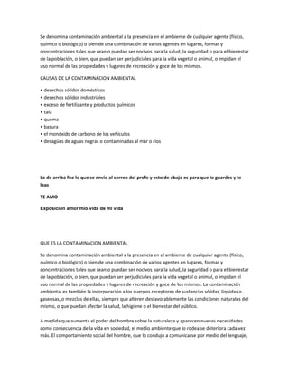 Este documento discute los efectos contaminantes de algunos combustibles y la contaminación ambiental. Explica que la combustión de combustibles fósiles como el petróleo y sus derivados, el carbón y el gas natural emiten gases contaminantes al aire. Además, las erupciones volcánicas también contribuyen a la contaminación del aire. Luego define la contaminación ambiental y enumera algunas de sus principales causas, como los desechos sólidos y líquidos industriales y domésticos, el exceso de fertilizantes, la tala y quema de