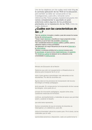 El documento define las tecnologías de la información y la comunicación (TIC) como elementos y técnicas utilizadas para procesar y transmitir información, principalmente informática, internet y telecomunicaciones. Explica que las TIC tienen ventajas como fomentar la interacción, el aprendizaje cooperativo y el desarrollo de habilidades digitales. También destaca que los docentes son figuras clave para incorporar las TIC en el aula de manera pedagógicamente significativa.