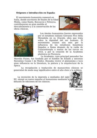 El humanismo renacentista se desarrolló en Europa entre los siglos XV y XVII, centrándose en los valores humanos a través de la cultura clásica griega y latina. Los humanistas se enfocaron en recuperar y estudiar los textos antiguos en su contexto original. También se preocuparon por mejorar la educación mediante nuevos métodos en las universidades, con énfasis en la gramática y la retórica. El humanismo comenzó en Italia y se difundió a España gracias a figuras como Antonio de Nebrija.