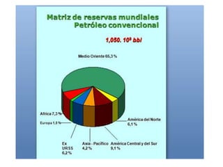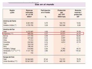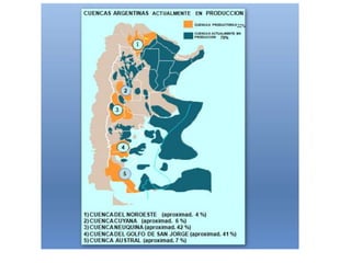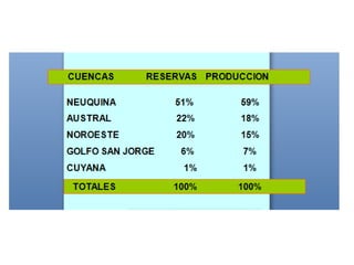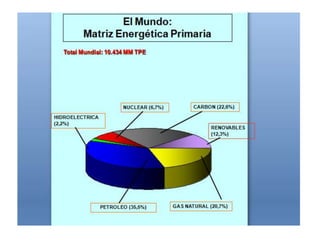 El documento presenta información sobre la matriz energética primaria mundial y de Argentina. A nivel mundial, el petróleo representa el 35,5% del total, seguido por el gas natural con un 20,7%. En Argentina, el gas natural es el principal recurso energético con un 48,4%, seguido por el petróleo con un 37,6%. Luego presenta estadísticas sobre la producción de petróleo y subproductos derivados en Argentina en los años 2009 y 2008.