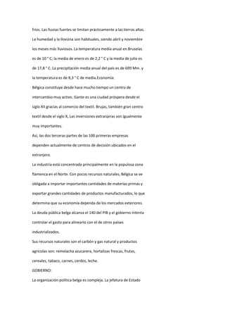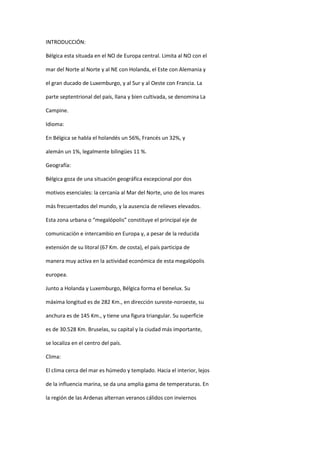 Bélgica se encuentra en el noroeste de Europa, limitando con Países Bajos, Alemania, Luxemburgo y Francia. El país tiene dos idiomas oficiales principales, holandés y francés, y su capital y ciudad más grande es Bruselas. Bélgica tiene una economía industrializada con pocos recursos naturales, por lo que depende de las importaciones de materias primas y exporta productos manufacturados. El gobierno belga es una monarquía constitucional y parlamentaria con un sistema político complejo que refleja las divisiones lingü