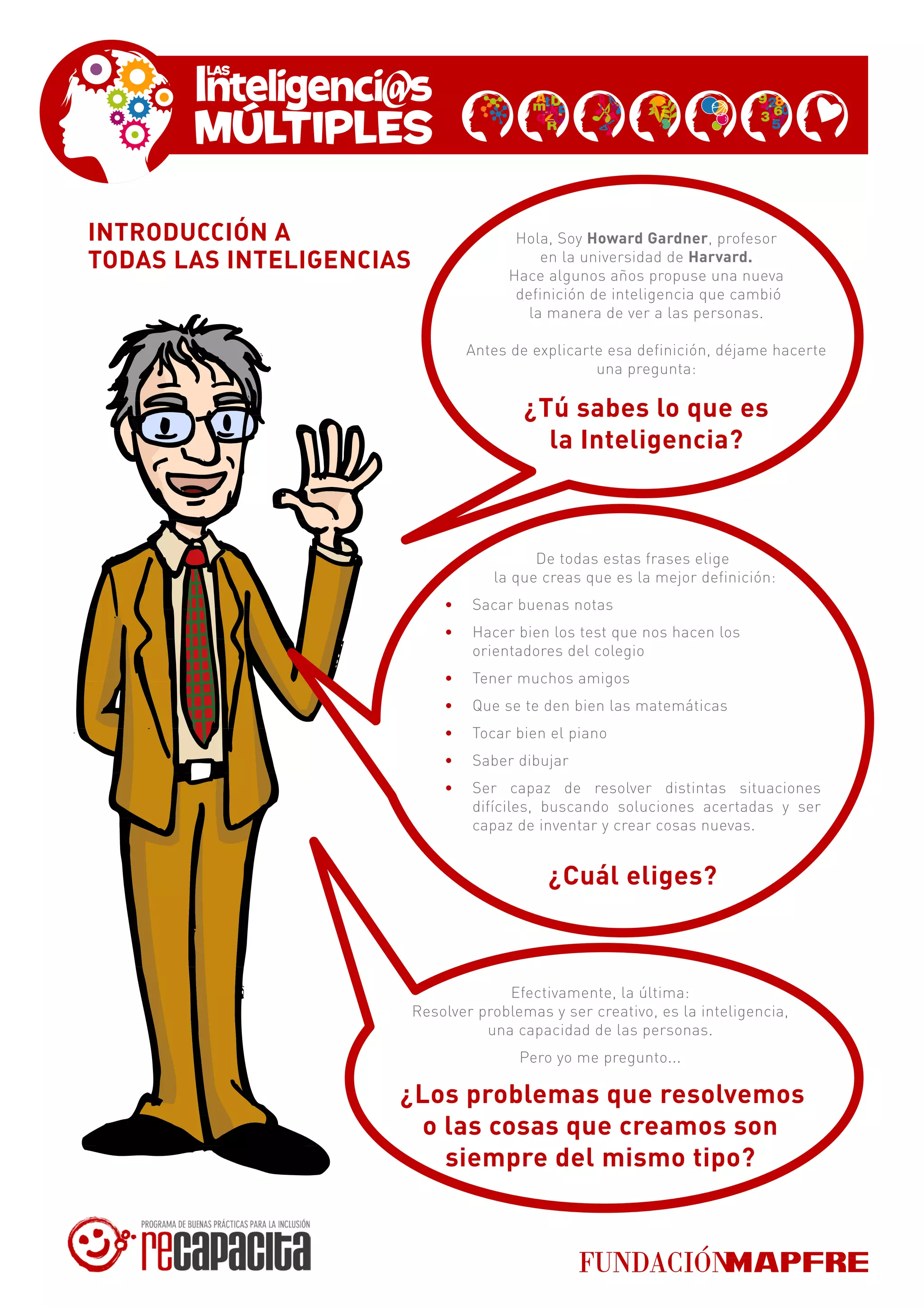 Howard Gardner propuso una nueva definición de inteligencia que reconoce múltiples tipos de inteligencia. Explica que las personas resuelven diferentes tipos de problemas y situaciones utilizando distintos tipos de inteligencia, como la lógica matemática, la corporal cinestésica y la lingüística. Además, sugiere que en lugar de tener un solo cerebro, las personas tienen siete cerebros diferentes, cada uno funcionando de manera distinta para resolver problemas utilizando información específica a ese tipo de inteligencia.