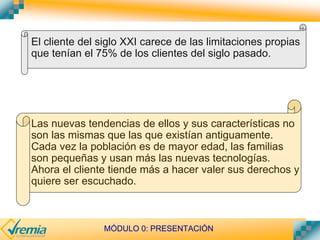 El documento describe cómo los clientes del siglo XXI son diferentes a los del siglo pasado, siendo más mayores, pequeñas familias, uso de tecnología, derechos del consumidor y respuestas rápidas. También explica que la atención al cliente es clave para la competitividad de las empresas y sugiere mejoras como el teléfono y correo electrónico como principales canales de comunicación, horarios extendidos de servicio, y respuestas rápidas a quejas.