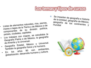 La geografía se originó y desarrolló como ciencia en la Antigua Grecia. A lo largo del tiempo, ha habido diferentes corrientes y tendencias en la geografía según los paradigmas científicos. La enseñanza de la geografía en la educación básica implica investigarla como disciplina y concretarla como asignatura, considerando elementos naturales y sociales del paisaje.