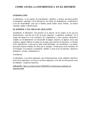 Este documento describe cómo la informática ayuda en el deporte. Explica que la informática permite el tratamiento automático de información a través de computadoras y cómo esto se ha aplicado en el deporte, por ejemplo para revisar jugadas dudosas, medir tiempos y trayectorias, y ayudar a los atletas a mejorar. También se usa para fines administrativos en asociaciones deportivas. El documento concluye que la informática es un factor importante tanto para las entidades deportivas como para los propios deportistas.