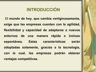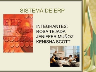 Este documento trata sobre los sistemas ERP (Enterprise Resource Planning). Explica que los ERP son sistemas de gestión que integran los procesos operativos de una empresa. Luego describe brevemente los orígenes de los ERP, sus ventajas como la reducción de costos e integración, y desventajas como su complejidad y costo. Finalmente, menciona ejemplos de uso de ERP en Panamá.