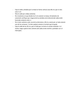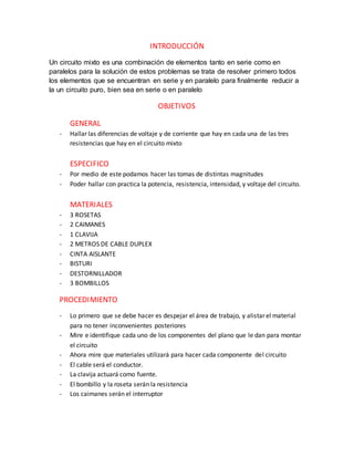 Este documento describe cómo construir un circuito eléctrico mixto con tres resistencias usando cables, clavijas, bombillos y rosetas. El objetivo es calcular las diferencias de voltaje y corriente en cada resistencia. El procedimiento explica cómo conectar estos componentes: dividir el cable, aislar los alambres, conectar la clavija como fuente, usar caimanes como interruptor y rosetas y bombillos como resistencias.