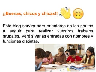 Este blog proporciona orientación para trabajos grupales en la escuela. Incluye entradas sobre recursos de investigación, criterios de evaluación, y unidades didácticas específicas. Los trabajos deben presentarse en cartulinas de 50cm x 65cm con ilustraciones e información bibliográfica. Se enfatiza la importancia de distribuir las tareas equitativamente entre los miembros del grupo.
