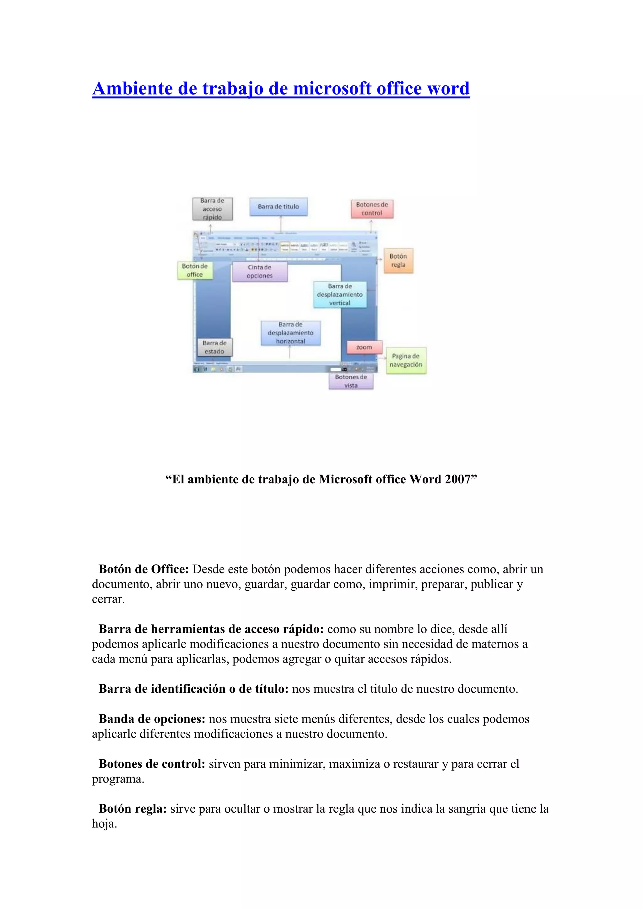 Este documento presenta una introducción a Excel 2010 y describe su ambiente de trabajo. Excel es un programa de hojas de cálculo que permite crear y analizar datos para tomar decisiones de negocios. Se puede usar para hacer un seguimiento de datos, crear modelos, escribir fórmulas y presentar datos en gráficos. El ambiente de trabajo de Word 2007 incluye botones para crear, guardar y cerrar documentos, barras para formato y desplazamiento, y vistas para ver el documento.
