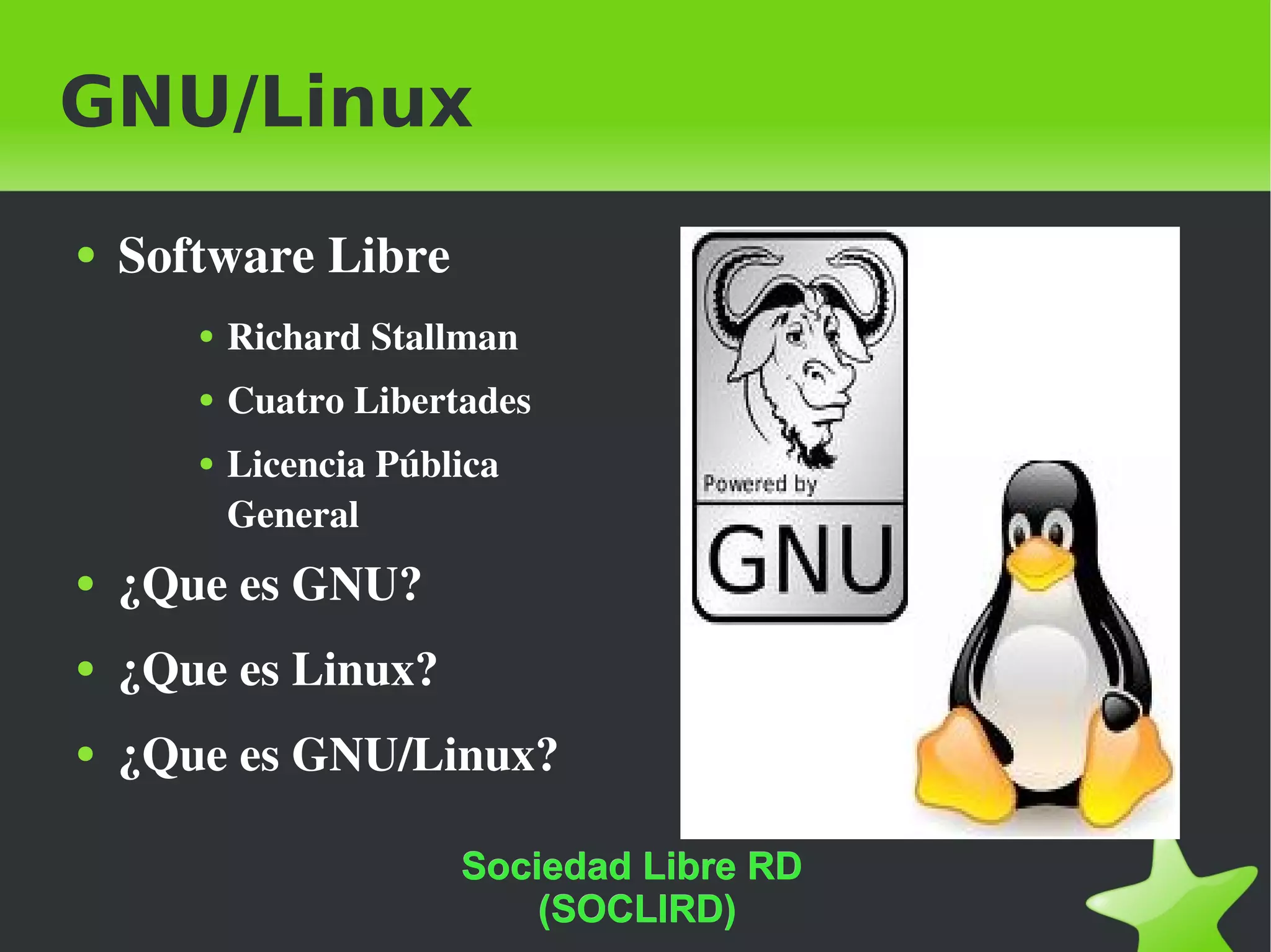 Este documento describe el movimiento de software libre, incluyendo sus orígenes con Richard Stallman y la Free Software Foundation. Explica conceptos clave como las cuatro libertades del software libre, la Licencia Pública General de GNU, y define qué es GNU, Linux y el sistema operativo GNU/Linux. También describe las principales distribuciones de GNU/Linux.