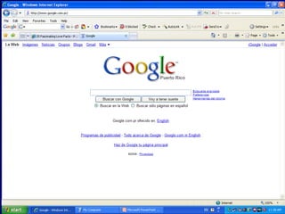 El documento proporciona una introducción básica a Internet y el correo electrónico. Explica que Internet es una red mundial de computadoras interconectadas que permite compartir información, y que el correo electrónico es un sistema para intercambiar mensajes a través de Internet de forma rápida y económica. También describe los componentes básicos como navegadores web, direcciones URL, enlaces, y proveedores populares de correo electrónico como Gmail.