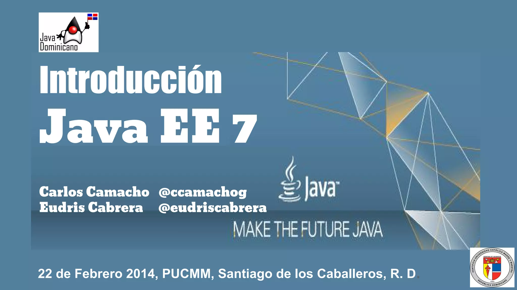 El documento introduce los conceptos fundamentales de Java Enterprise Edition (Java EE) 7. Destaca que Java EE 7 simplifica el desarrollo proporcionando una base común para los diversos tipos de componentes en la plataforma a través de más anotaciones y menos configuración XML. También cubre las principales APIs de Java EE 7 como JPA, JAX-RS, JMS y JSF.