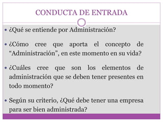 Este documento introduce los conceptos básicos de la teoría general de la administración. Explica que la administración implica planificar, organizar, dirigir y controlar los recursos de una organización para alcanzar objetivos de manera eficiente y eficaz. Además, resume brevemente los orígenes y desarrollo histórico de la administración desde la época primitiva hasta la actualidad, y define la administración como un proceso universal aplicable a cualquier tipo de organización o grupo social.