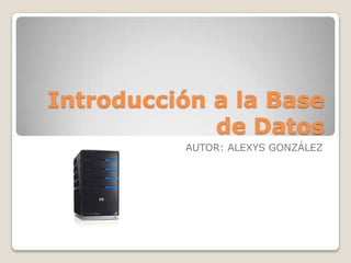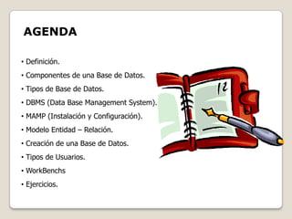 Este documento introduce los conceptos básicos de las bases de datos, incluyendo su definición, componentes, tipos, DBMS, instalación de MAMP, modelo entidad-relación, creación de bases de datos, tipos de usuarios y workbenches. Explica conceptos clave como tablas, registros, campos, claves primarias y foráneas, y índices. También incluye ejemplos de cómo crear una base de datos en PHPMyAdmin.