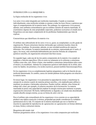 El documento introduce los conceptos fundamentales de la bioquímica. Explica que los organismos vivos están compuestos de moléculas inanimadas que interactúan de manera compleja. A pesar de estar formados por los mismos tipos de moléculas que la materia inerte, los organismos vivos se caracterizan por su alta organización, capacidad de extraer y transformar energía, y reproducirse. La bioquímica busca entender cómo estas moléculas generan y mantienen la vida a través de sus interacciones.