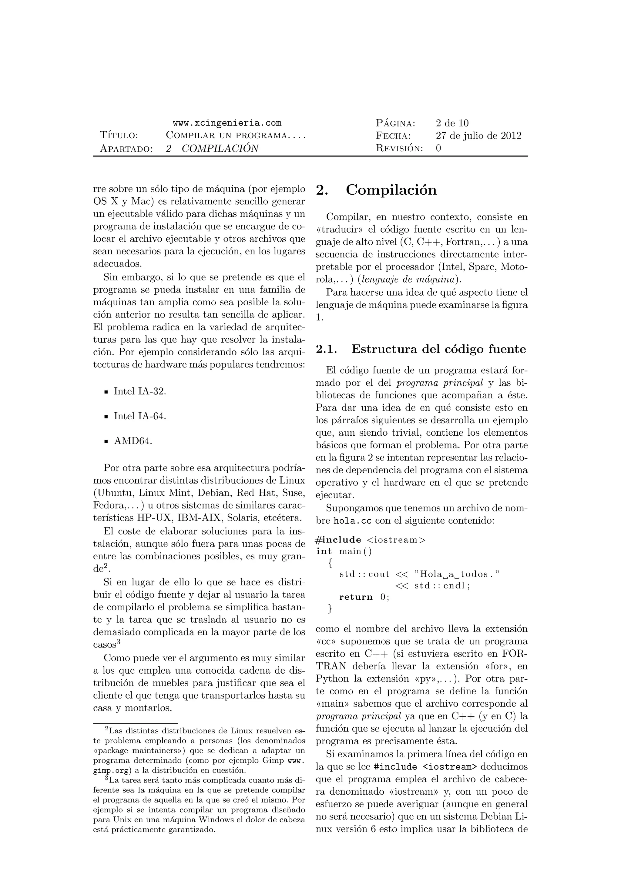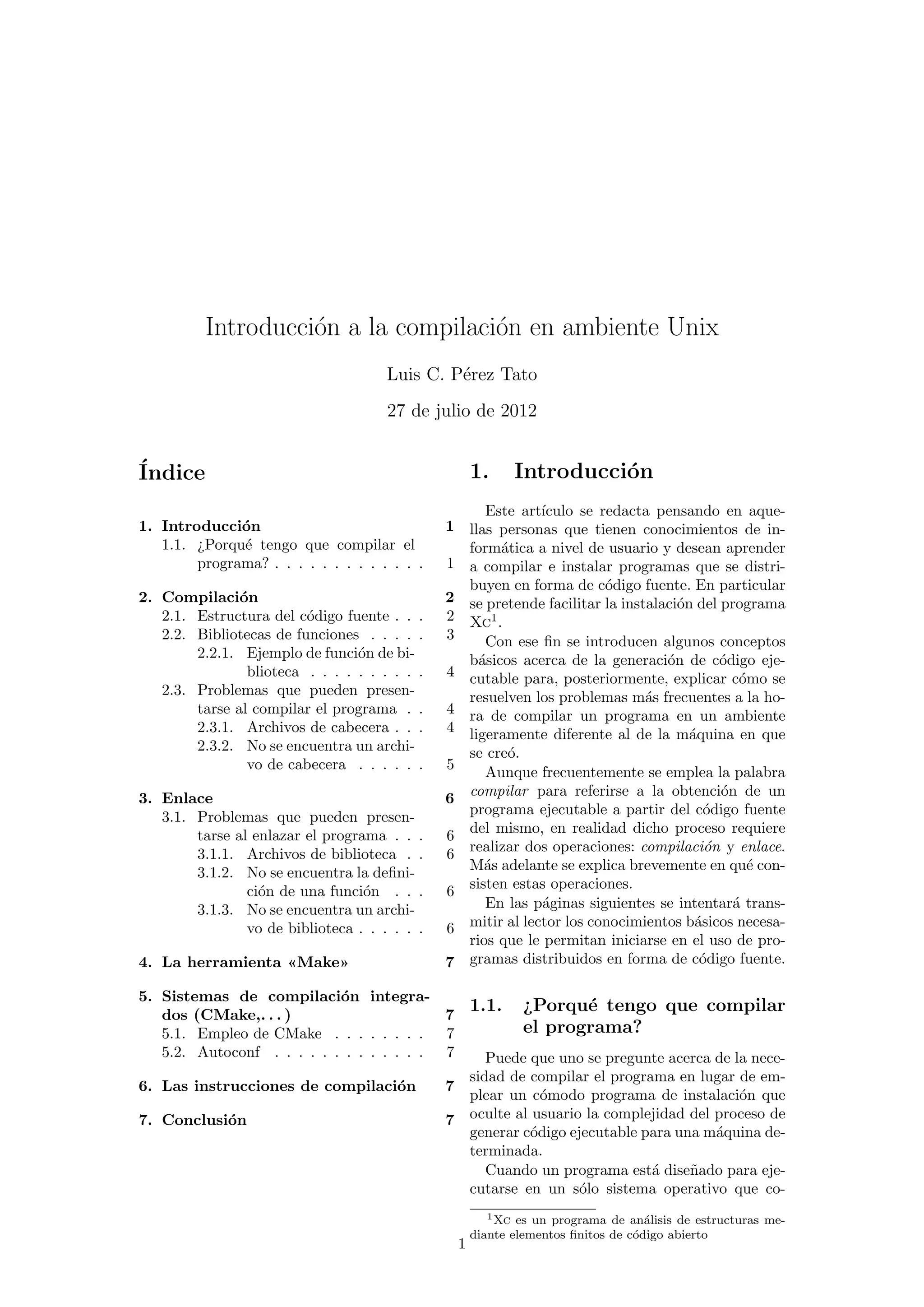 Este documento introduce los conceptos básicos de la compilación de programas en Unix. Explica que la compilación traduce el código fuente de alto nivel a instrucciones de máquina y consta de dos pasos: compilación y enlace. También describe la estructura típica de un programa y sus bibliotecas de funciones, e ilustra el proceso de compilación con un ejemplo sencillo.