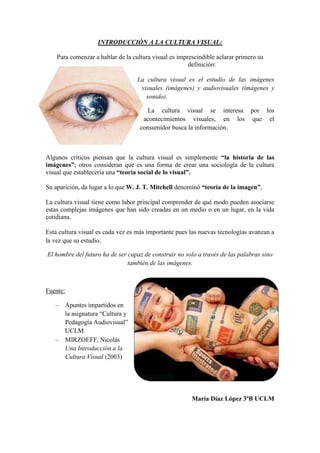 La cultura visual estudia las imágenes visuales y audiovisuales, así como los eventos visuales en los que los consumidores buscan información. Algunos críticos ven la cultura visual como la historia de las imágenes, mientras que otros proponen una teoría social de lo visual. La cultura visual trata de comprender cómo las imágenes creadas en un medio o lugar se asocian en la vida cotidiana.