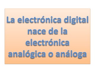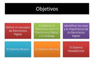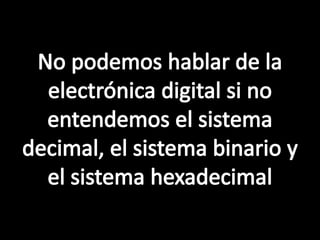 Este documento define la electrónica digital y la diferencia con la electrónica analógica. Explica que la electrónica digital usa el sistema binario para representar información como una serie de bits que pueden estar encendidos u apagados, mientras que la electrónica analógica representa información como señales continuas. También describe los sistemas decimal y hexadecimal y cómo la electrónica digital se usa ampliamente en computadoras, dispositivos electrónicos y otras tecnologías modernas.