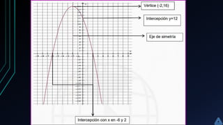 Este documento presenta información sobre las funciones cuadráticas. Explica que una función cuadrática es una función polinómica de grado 2 de la forma f(x)=ax2+bx+c. Describe las características de la gráfica de una función cuadrática, la cual es una parábola. También detalla los cuatro tipos de gráficas de funciones cuadráticas y resuelve ejemplos para ilustrar cómo graficar cada tipo. El objetivo es que los estudiantes comprendan las propiedades de las funciones cuadráticas y cómo