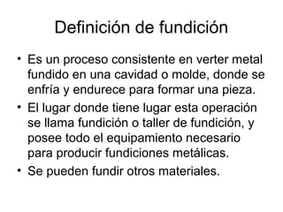 El documento proporciona una introducción al proceso de fundición. Explica que la fundición implica verter metal fundido en un molde para formar una pieza. Luego describe brevemente la historia de la fundición, los métodos de fundición comunes como la fundición de arena, y los materiales utilizados como modelos y metales. Finalmente, resume los pasos clave en el proceso de fundición como la fabricación de moldes y machos, la fusión y colada del metal, y los oficios relacionados.