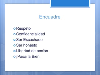 El documento presenta los fundamentos de la terapia Gestalt. Se explica que se enfoca en el autoconocimiento, el autoapoyo y la responsabilidad individual para satisfacer las propias necesidades. Promueve estar presente en el aquí y ahora a través del diálogo, la escucha activa y la conciencia plena del cuerpo, sentimientos y pensamientos. El objetivo es desbloquear patrones limitantes y favorecer el crecimiento y autorrealización de la persona.
