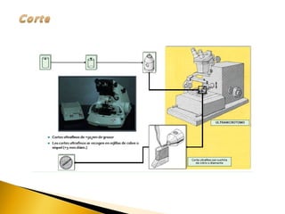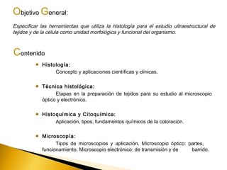 Este documento describe conceptos y técnicas fundamentales de histología, incluyendo la preparación de tejidos, coloración e identificación de estructuras al microscopio. Explica las etapas de fijación, deshidratación, inclusión e identificación de tejidos, así como técnicas de coloración como hematoxilina-eosina. El objetivo es especificar las herramientas de la histología para estudiar la ultraestructura de tejidos y células.