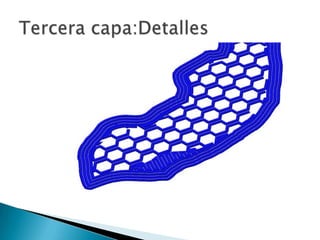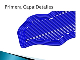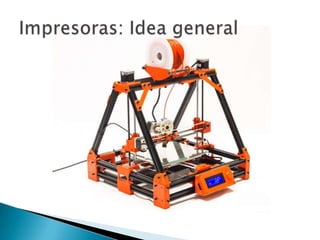 El documento detalla el proceso de impresión 3D, incluyendo la obtención de archivos en formatos .stl y .obj, y la conversión de esos archivos usando programas como slic3r y cura. Se menciona la tecnología aditiva y se proporciona información sobre la comunidad de impresión 3D en Barcelona, incluyendo enlaces a recursos y listas de correo. También se discute la metodología de impresión capa por capa para obtener la pieza final.