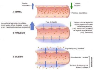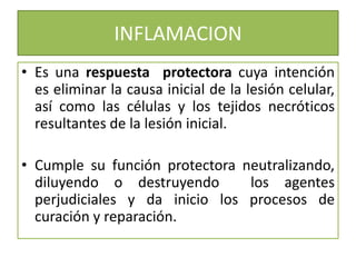 La inflamación es una respuesta protectora que busca eliminar agentes nocivos y reparar tejidos, aunque puede causar daño adicional a tejidos sanos. Se clasifica en inflamación aguda y crónica, siendo la primera una respuesta rápida y de corta duración con cambios vasculares y celulares, y la segunda una respuesta prolongada con destrucción y reparación tisular simultánea. Los mediadores químicos de la inflamación, como citocinas, pueden provocar efectos sistémicos que afectan al organismo en su totalidad.