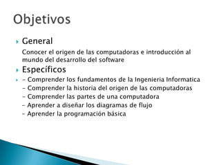 Este documento presenta los objetivos de un curso de introducción a la ingeniería informática. Los objetivos generales son conocer el origen de las computadoras y el desarrollo del software. Los objetivos específicos incluyen comprender los fundamentos de la ingeniería informática, la historia del origen de las computadoras, las partes de una computadora, diagramas de flujo y programación básica. El curso cubrirá introducción a la informática, generaciones de computadoras, elementos de computadora, diagramas de flujo, programación y programación orientada a objet