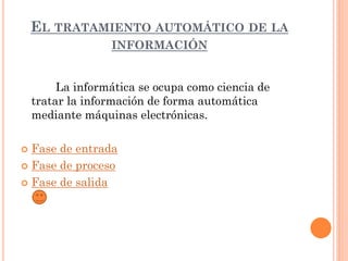 La informática se ocupa del tratamiento automático de la información mediante máquinas electrónicas. El proceso involucra tres fases: entrada de datos, procesamiento y salida de resultados. Los datos se introducen a través de periféricos de entrada como el teclado y el ratón, el ordenador los procesa en la memoria, y muestra los resultados a través de periféricos de salida como el monitor y la impresora.