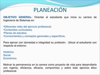 Este documento presenta la planeación de la introducción a la carrera de Ingeniería de Sistemas en la Universidad del Tolima para el primer semestre de 2010. El objetivo general es orientar a los estudiantes sobre los roles profesionales, contenidos curriculares, planes de estudio y conceptos generales y específicos de la carrera para que puedan ejercer su profesión con idoneidad e integridad. El temario incluye acuerdos pedagógicos, círculos de participación académica y social, procesos tutoriales y evalu
