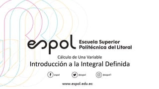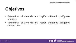 Este documento introduce el concepto de integral definida y cómo se puede usar para calcular el área bajo una curva. Explica cómo aproximar el área usando polígonos inscritos y circunscritos, dividiendo el intervalo en subdivisiones más pequeñas. También presenta los objetivos de determinar el área de una región usando estos métodos y referencias adicionales sobre el tema.