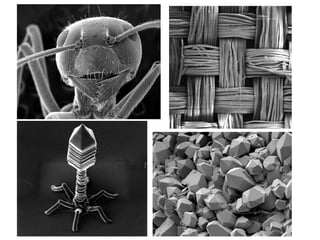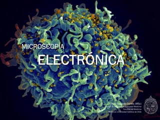La microscopía electrónica utiliza electrones para ofrecer un mayor poder de resolución comparado con la microscopía óptica, permitiendo la visualización detallada de estructuras celulares. Existen dos tipos principales: la microscopía electrónica de transmisión (TEM) y la microscopía electrónica de barrido (SEM), cada una con sus propias ventajas y desventajas en cuanto a resolución y tipo de imágenes producidas. La preparación adecuada de las muestras es crucial, ya que afecta directamente la resolución y la calidad de la imagen obtenida.
