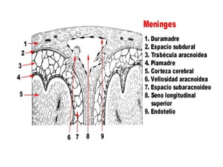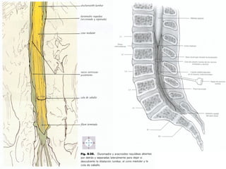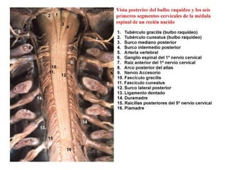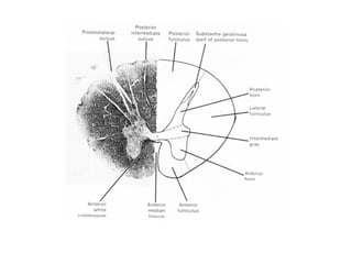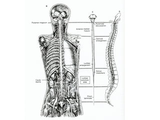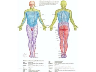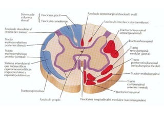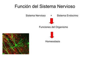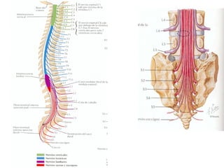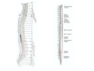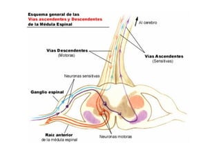 Este documento introduce la neuroanatomía y el sistema nervioso. Explica que el sistema nervioso y el sistema endocrino trabajan juntos para controlar las funciones del cuerpo como la homeostasis. Describe que el sistema nervioso central (SNC) integra la información y el sistema nervioso periférico (SNP) transmite estímulos y respuestas. Explica que la médula espinal y los nervios espinales contienen circuitos neuronales que controlan los reflejos y que la médula espinal está protegida por huesos y meninges.