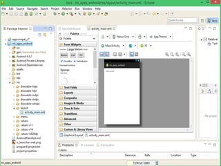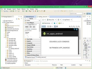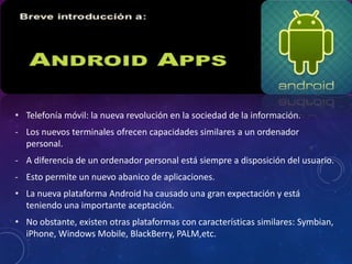 Android es una plataforma móvil de código abierto que combina una plataforma de desarrollo libre y sin pagar royalties, software libre como Linux y bases de datos SQL, y una máquina virtual Java optimizada. El documento describe la arquitectura de Android, incluyendo su kernel Linux, máquina virtual Dalvik, librerías nativas y entorno de aplicaciones. También cubre la instalación del entorno de desarrollo de Android basado en Eclipse e incluye pasos para crear un dispositivo virtual Android.