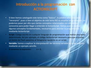 Este documento introduce conceptos fundamentales de programación necesarios para entender ActionScript, incluyendo scripts, variables, expresiones, funciones, acciones, parámetros y programación orientada a objetos. Explica que los scripts son código en cualquier lenguaje que realiza una tarea, las variables pueden cambiar de valor, las funciones realizan tareas específicas, y las acciones son funciones predefinidas por Flash. También define parámetros y la organización de información en clases y objetos en programación orientada a objetos.