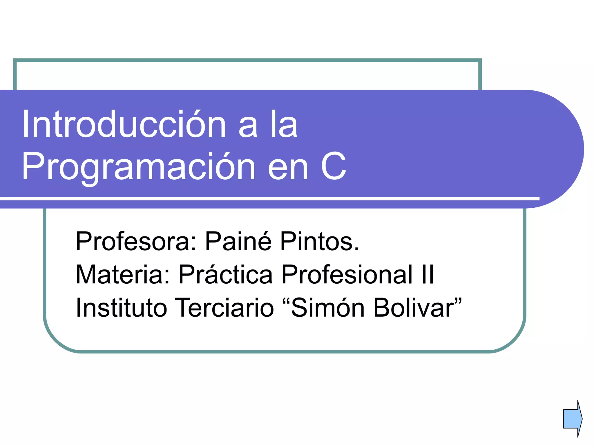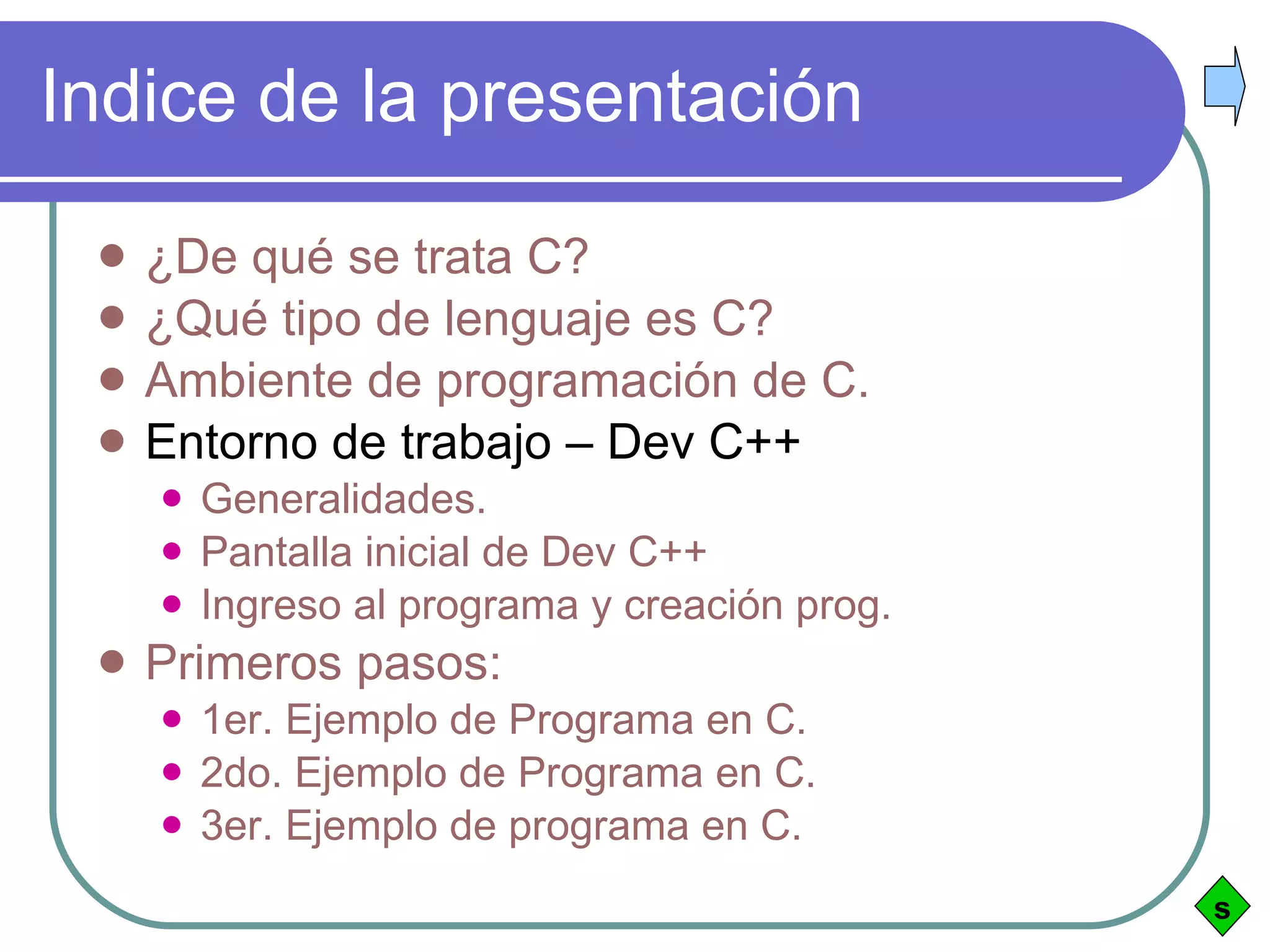 El documento presenta una introducción al lenguaje de programación C. Explica que C es un lenguaje compilado de alto nivel que permite programar a bajo nivel. Describe el entorno de desarrollo Dev C++ y muestra tres ejemplos básicos de programas en C, incluyendo la estructura general de un programa, declaración de variables, operadores aritméticos e instrucciones como scanf, printf e if.